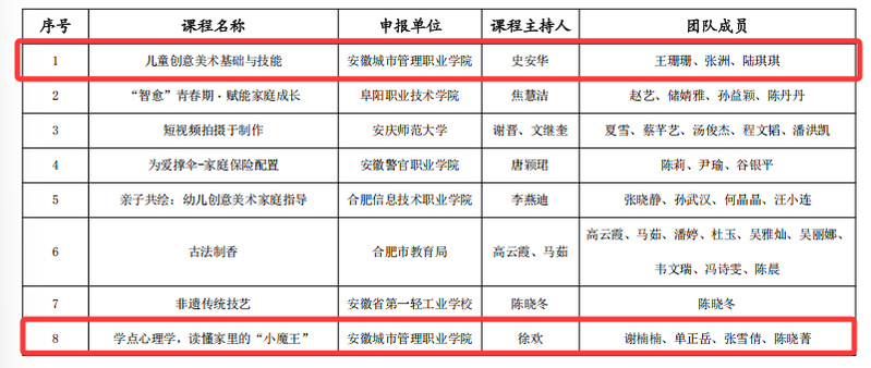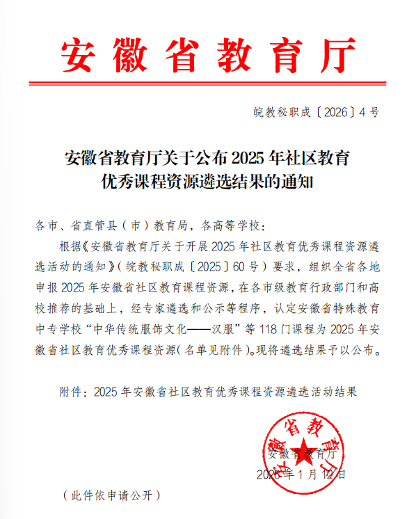 近日,安徽省教育厅公布了2025年社区教育优秀课程资源遴选结果,学院申报的《儿童创意美术基础与技能》与《学点心理学,读懂家里的“小魔王”》两项课程资源成功入选,体现了学院在社区教育资源建设方面的扎实积累与创新成果。