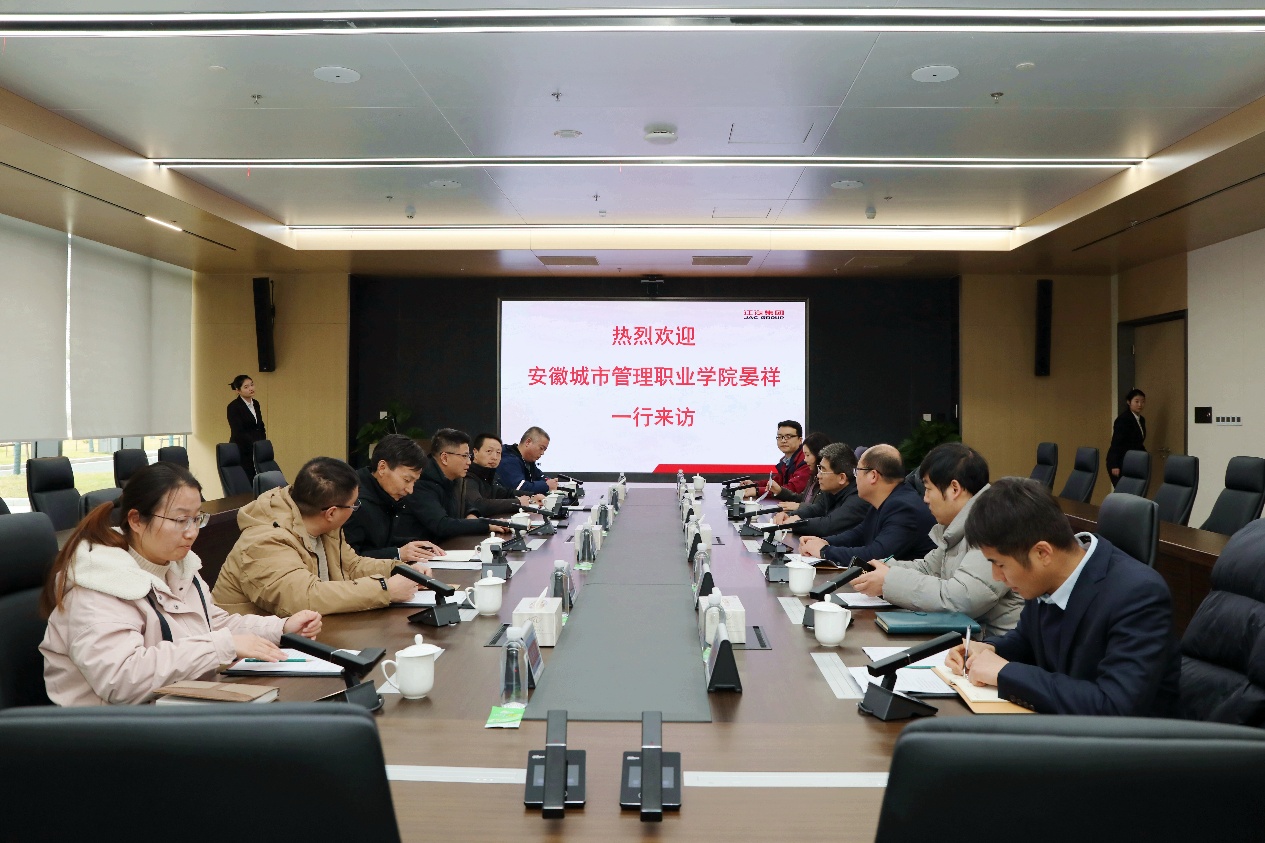 为深入贯彻落实中共中央、国务院关于高校毕业生就业工作的决策部署,积极响应“书记校长访企拓岗促实习就业”专项行动要求,进一步拓宽校企合作渠道,实现人才培养与产业需求精准对接,1月 27日,学院党委书记晏祥,党委委员、副院长聂宗瑶等一行 6人赴江汽集团开展走访交流。江汽集团控股公司党委副书记、董事、工会主席许远怀,人力资源管理中心招聘服务部部长宫文东等企业领导热情接待并参与座谈。