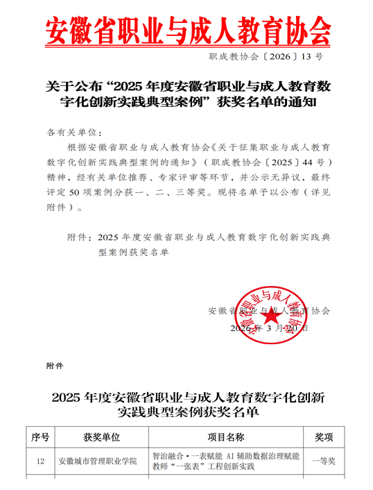 近日,安徽省职业与成人教育协会发布《关于公布“2025年度安徽省职业与成人教育数字化创新实践典型案例”获奖名单的通知》,我院报送的《智治融合·一表赋能AI辅助数据治理赋能教师“一张表”工程创新实践》案例,经专家评审、公示无异议,荣获一等奖。