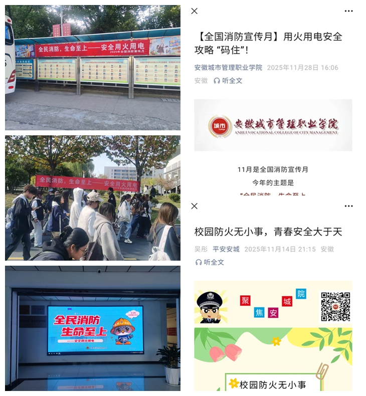 充分利用校园电子大屏、宣传栏、微信公众号等载体,宣传消防宣传月活动主题、普及用火用电安全知识,推送消防科普短视频、警示教育片,营造处处见安全的校园宣传氛围。