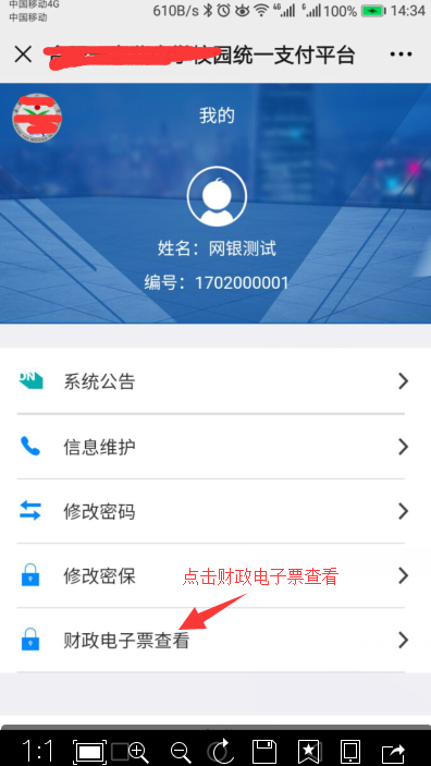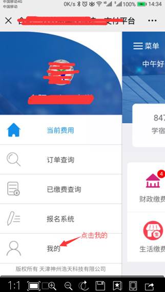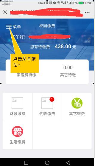 1、学生在校园统一支付平台缴费成功、待银行结算之后(正常情况第三天下午以后,节假日顺延),学生通过微信或支付宝app登录校园统一支付平台,点击菜单按钮,如图1
