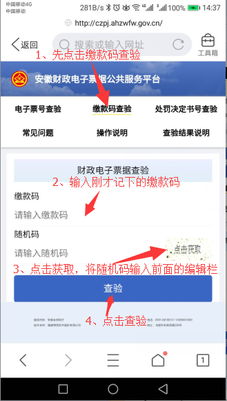 5、进入安徽财政电子票据公共服务平台后,先点击缴款码查验,再将缴款码直接输入缴款识别码,然后点击获取随机码输入前面的编辑栏(不区分大小写),最后点击查询;如图5
