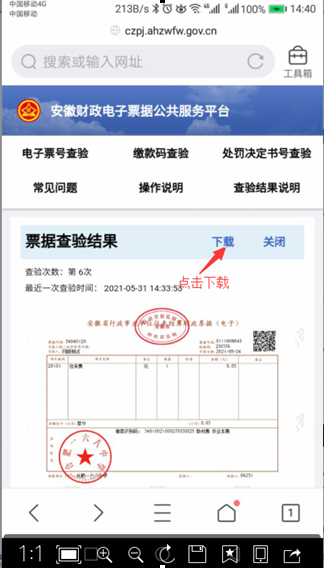 6、在票据查验结果界面,点击下载按钮将电子发票下载到本地如图6