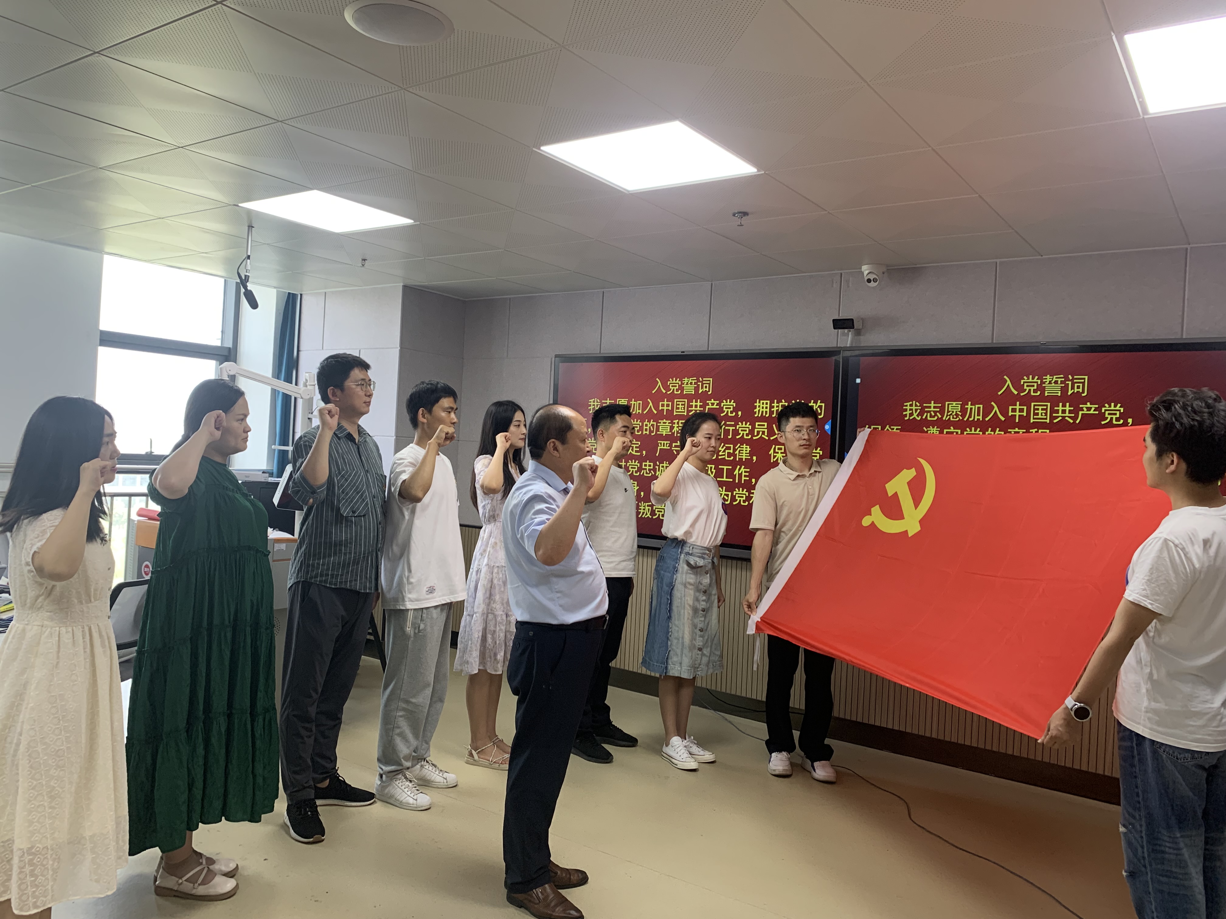 “我志愿加入中国共产党,拥护党的纲领,遵守党的章程……”。在鲜红的党旗面前,党总支书记于德强带领全体党员高举右拳,庄严肃穆地重温入党誓词,一双双坚定不移的目光,一句句铿锵有力的誓言,全体党员仿佛又回到了第一次入党时的情景。