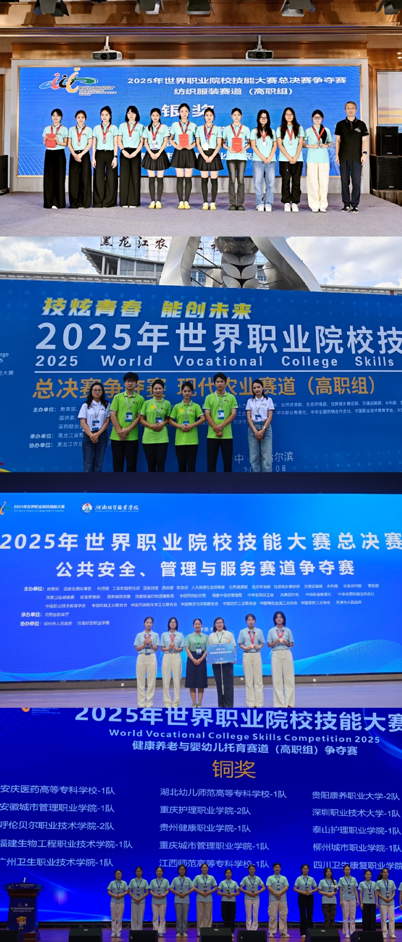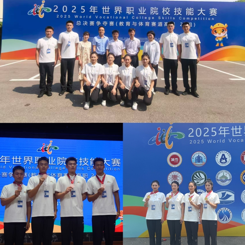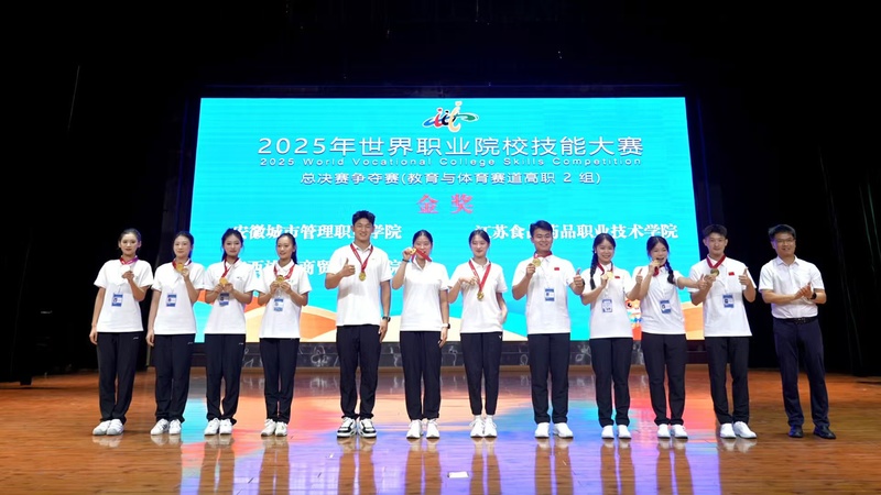 赛场之上,学院选手沉着冷静,尽显风采。教育与体育类赛道中,学院有两支队伍参赛,其中一队凭借精湛技艺、灵活应变和默契配合,以“零失误”的完美表现实现历史性突破,斩获学院在该项赛事的首枚金牌;二队亦表现出色,获得铜牌。纺织与服装赛道团队稳扎稳打,在与强劲对手的多轮交锋中沉着应战,最终摘得银牌。在现代农业、健康养老与婴幼儿托育、公共安全与管理服务三个赛道中,学院选手同样发挥出色,均获铜牌,充分展现了学院在多专业领域人才培养的综合实力。