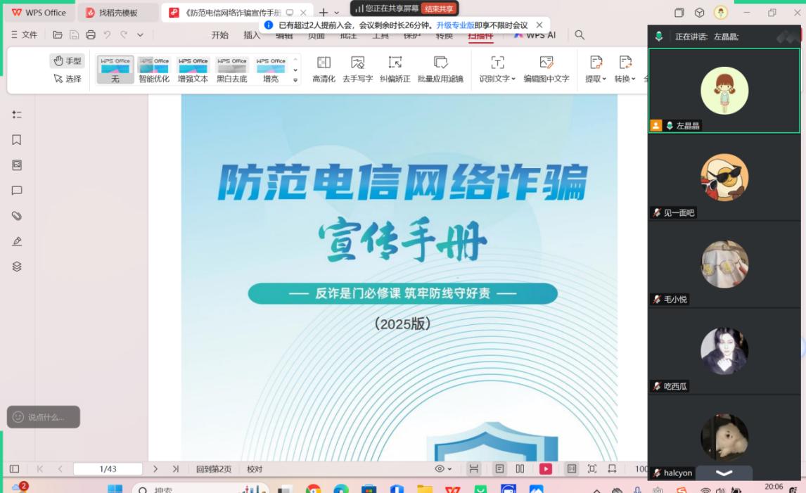 为筑牢校园安全与反诈防线,民政管理学院于2025年9月3日-10日,分形式开展开学安全第一课暨防范电信网络诈骗主题班会,2024级线下集中参与,2023级线上同步学习,核心围绕两本反诈宣传手册展开。