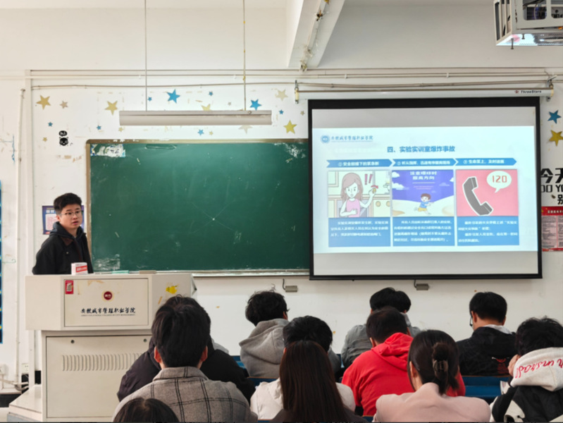 最后,针对实验实训中的常见安全风险,班会重点讲解了应急处理方法。从火灾发生时的“断电-灭火-疏散”流程、灭火器与消防栓的正确使用,到触电事故的“切断电源-寻求专业医疗救助”,再到化学品灼伤和处理,详细讲解应急处理步骤,确保学生既能“规范操作防风险”,又能“熟练应急保安全”。