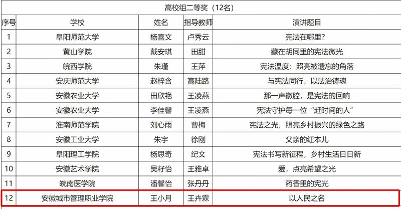 “学宪法 讲宪法”演讲比赛面向教育系统各级各类学校开展,设小学、初中、高中和高校(含高职)四个组别。主题演讲内容以宪法的精神和原则为主,抒发爱党、爱国、爱社会主义的真情实感,讲述深入学习习近平法治思想和宪法法治知识、树立法治意识的心得体会。王小月同学的演讲《以人民之名》,以饱满的热情、流畅的表达和深刻的见解,赢得了评委的认可。更值得一提的是,王小月同学是高校组别中唯一一位来自高职院校的二等奖获奖者。
