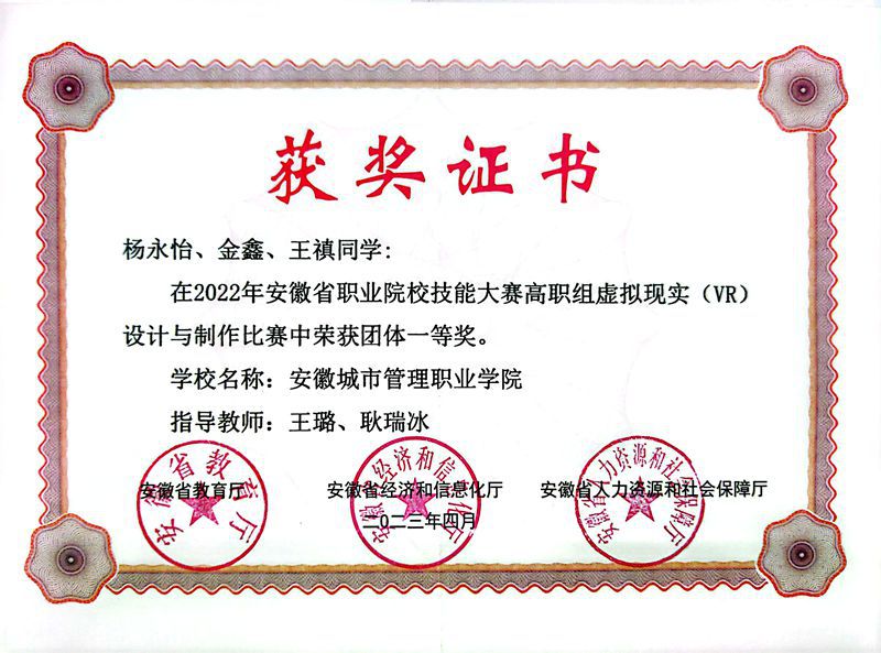 (7)2022年安徽省技能大赛虚拟现实(VR)设计与制作一等奖;