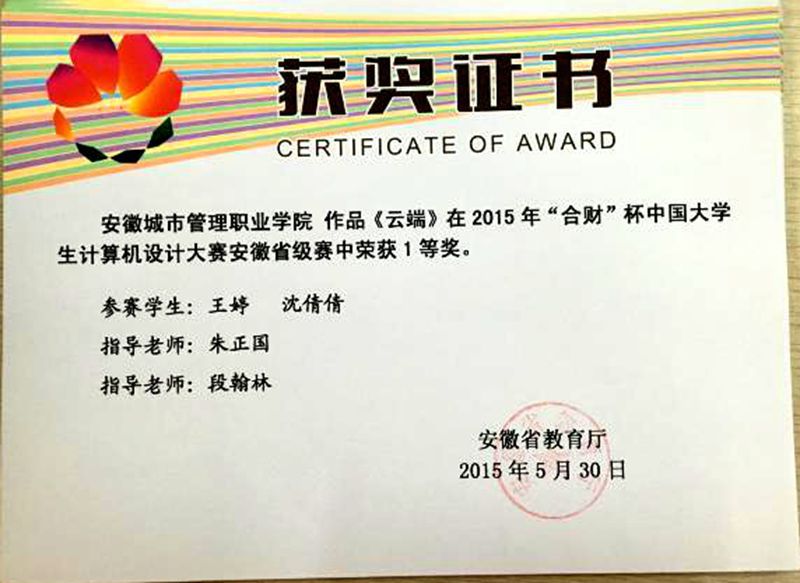(4)2017年中国大学生计算机设计大赛安徽省级赛,最终荣获一等奖1项、三等奖4项;