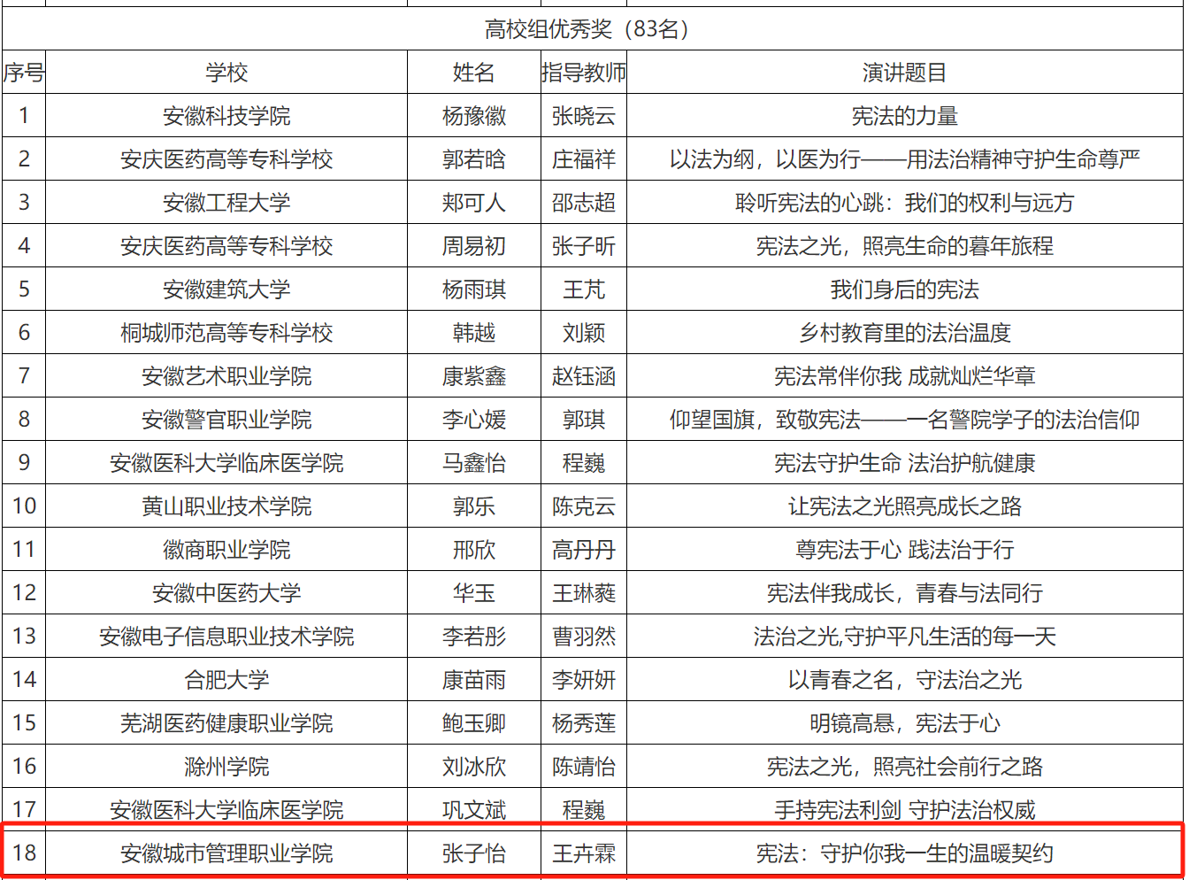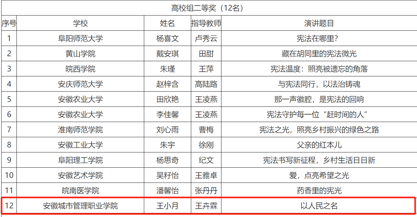 近日,安徽省教育厅组织开展了第十届全省学生“学宪法讲宪法”演讲比赛,我院数字创意学院2024级数字媒体技术3班王小月同学凭借题为《以人民之名》的精彩演讲,获得高校组二等奖的好成绩;学前与特殊教育学院学院2024级特殊教育2班张子怡同学演讲的《宪法:守护你我一生的温暖契约》荣获高校组优秀奖。其中,王小月是高校组别中唯一一位来自高职院校的二等奖获奖者,这也是我院在此项赛事中的新突破。