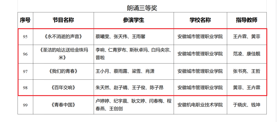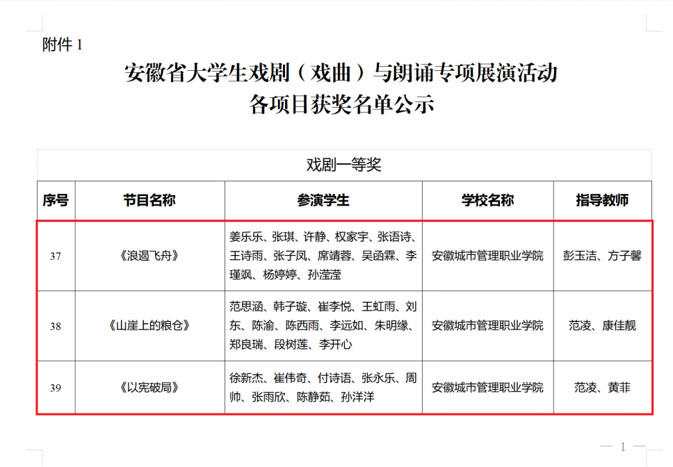 近日,由安徽省教育厅主办的全省戏剧(戏曲)与朗诵专项展演评选结果揭晓。学院团委积极响应《关于全面加强和改进新时代学校美育工作的意见》中关于美育工作的要求,高度重视此次展演,精心筹备,共选送7部作品参赛,其中由学前教育学院报送的三个戏剧作品《浪遏飞舟》《山崖上的粮仓》《以宪破局》全部荣获省级一等奖;四个朗诵作品《永不消逝的声音》《圣洁的哈达送给金珠玛米》《我们的青春》《百年交响》均获得省级三等奖。此次展演中,我院成绩斐然,创下我院参加该类赛事获奖的最佳记录。