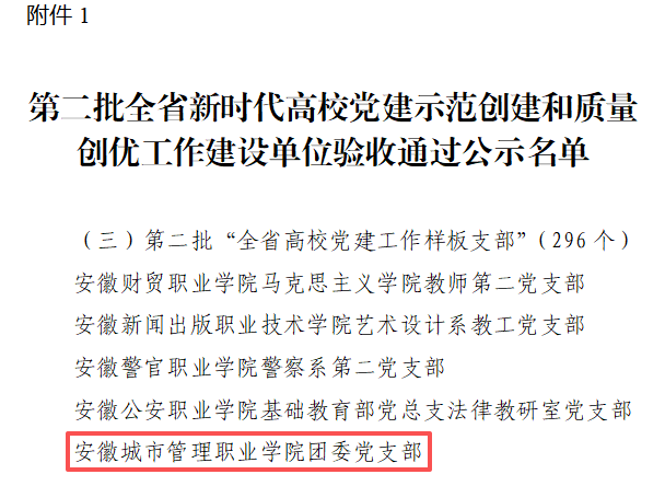 近日,安徽省委教育工委公布了第二批全省新时代高校党建示范创建和质量创优工作及第一批全省高校“双带头人”教师党支部书记工作室建设单位验收结果。经建设单位对标自查、学校党委审核把关、工作组实地评估、省委教育工委审查等环节,我院团委党支部通过培育创建验收,成为第二批“全省高校党建工作样板支部”之一。这是对我院基层党建质量的高度认可,更是对院团委党支部聚焦主责主业、创新服务青年的充分肯定。