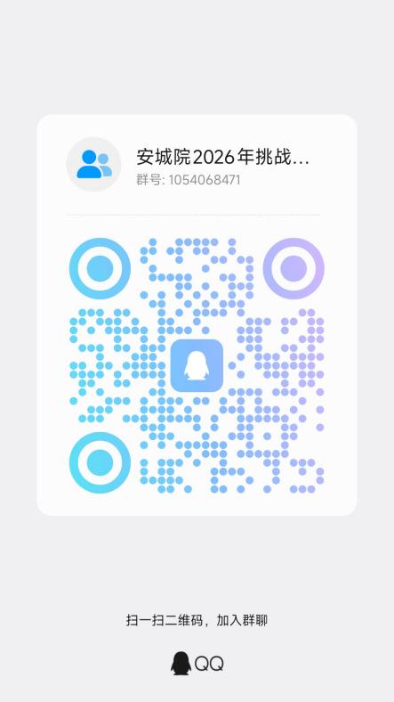 请有意向报名的指导教师和参赛队负责人加入QQ群1054068471(安城院2026年挑战杯创业计划竞赛预选群),后续信息通知、材料收集、具体时间节点将在群内通知,请予以密切关注。