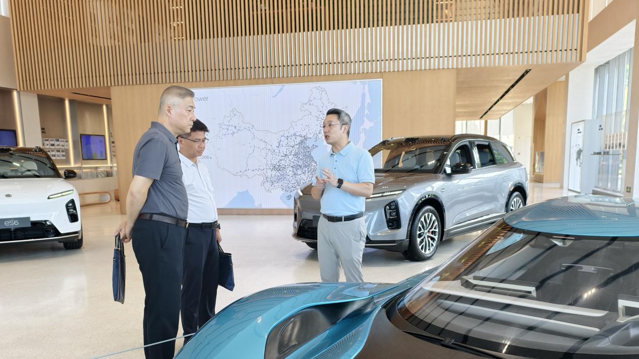 在蔚来汽车(安徽)有限公司常务副总汪道涵的陪同下,调研组一行参观了公司的生产车间和展厅,详细了解了蔚来汽车的发展历程、创新理念以及未来规划,听取了蔚来汽车公司对于其换电系统、充电网络及数智化管理平台的介绍。