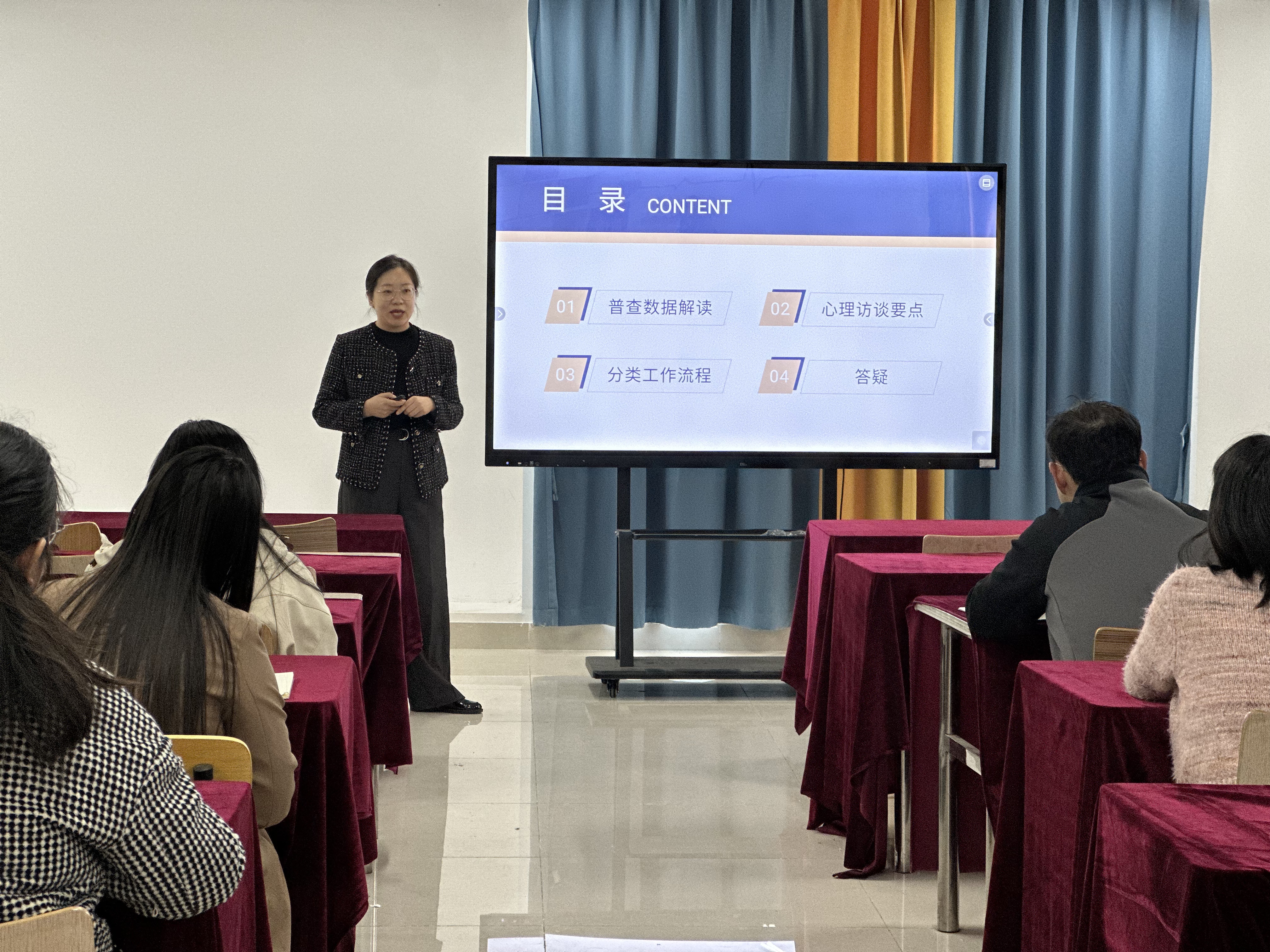 培训围绕“普查数据解读”“心理访谈要点”“分类工作流程”“答疑”四大模块展开。主讲人详细介绍了心理普查数据的分级预警机制,包括预警一档至三档及日常关注群体的界定标准与干预流程,并结合实际案例,系统讲解了心理访谈中的沟通技巧、风险评估要点及资源评估。培训还强调了危机干预流程、档案记录的规范性以及家校协同的重要性,帮助辅导员在实际工作中做到早发现、早干预、早治疗。