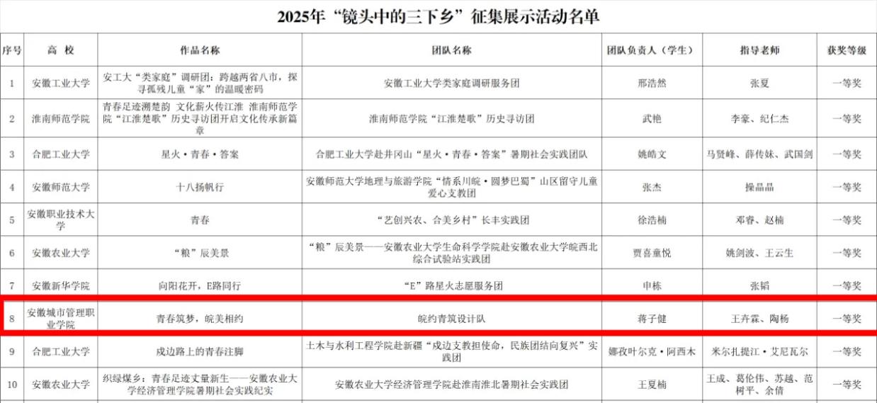 近日,由共青团安徽省委、安徽省学生联合会及安徽农业大学联合主办的2025年安徽省“镜头中的三下乡”征集展示活动评选结果现已正式揭晓,我院团委“皖约青筑”设计队创作的作品——《青春筑梦,皖美相约》凭借真挚的情感和生动的影像,荣获一等奖!值得一提的是,该队伍是本届一等奖中唯一入选的高职院校代表队。