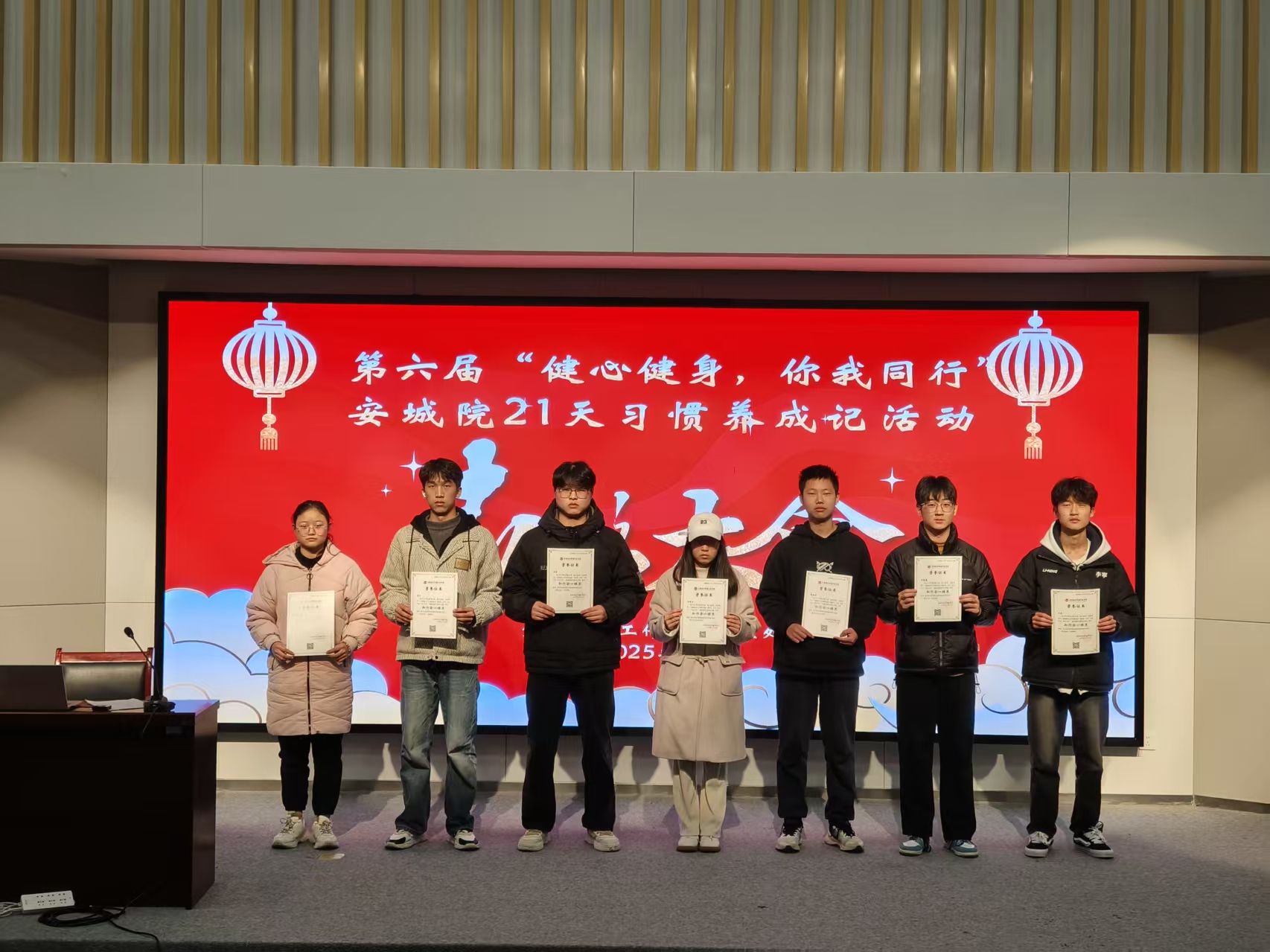 第六届“健心健身,你我同行”安城院21天习惯养成记活动收官啦!本次活动由学生处主办、大学生心理健康教育与咨询中心(以下简称“心理中心”)承办,以“培养健康习惯、捕捉生活美好、提升心理韧性”为核心目标,打卡周期为2025年10月10日—12月12日,分为“习惯初步养成期”与“习惯巩固期”两个阶段。活动得到全校学生积极响应,共有3219名学生报名参与,其中1318名同学在初步养成期打满21天及以上,403名同学在巩固期达标,获得相应学分,397名同学两期均圆满完成打卡,获得活动认证证书。12月24日,心理中心分别在两校区艺馨楼报告厅、学生一站式活动中心发放了证书。(本文引用的内容经当事人知情同意,不同意使用个人信息的文中人物为化名)