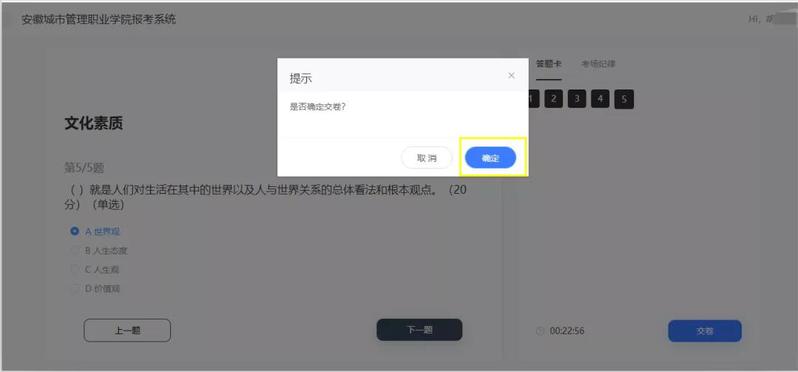 当所有考题答完后,确认无误后,点击“交卷”,确认,完成考试:
