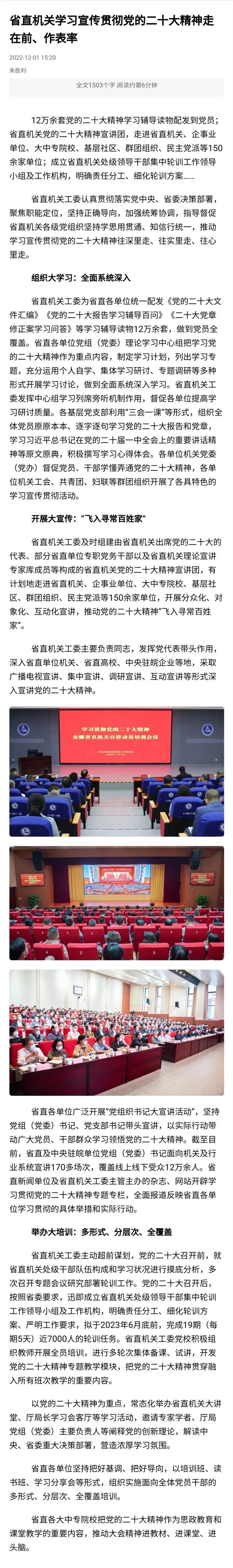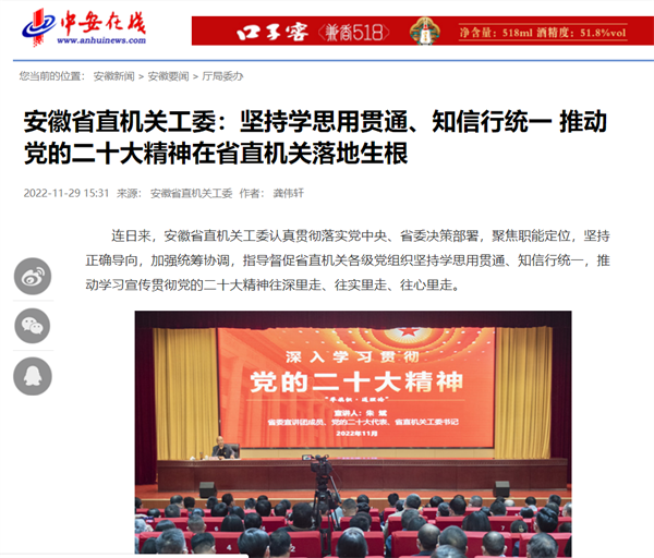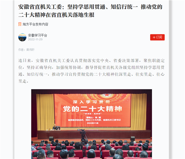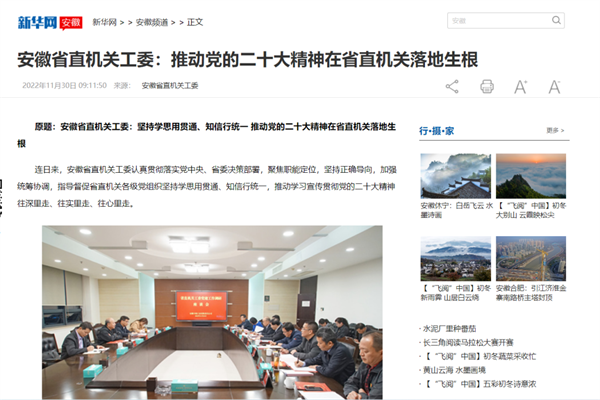 编者按:连日来,安徽省直机关工委认真贯彻落实党中央、省委决策部署,聚焦职能定位,坚持正确导向,加强统筹协调,指导督促省直机关各级党组织坚持学思用贯通、知信行统一,推动学习宣传贯彻党的二十大精神往深里走、往实里走、往心里走。以下是新华网、安徽日报、学习强国、中安在线等中央及省主流媒体报道情况。