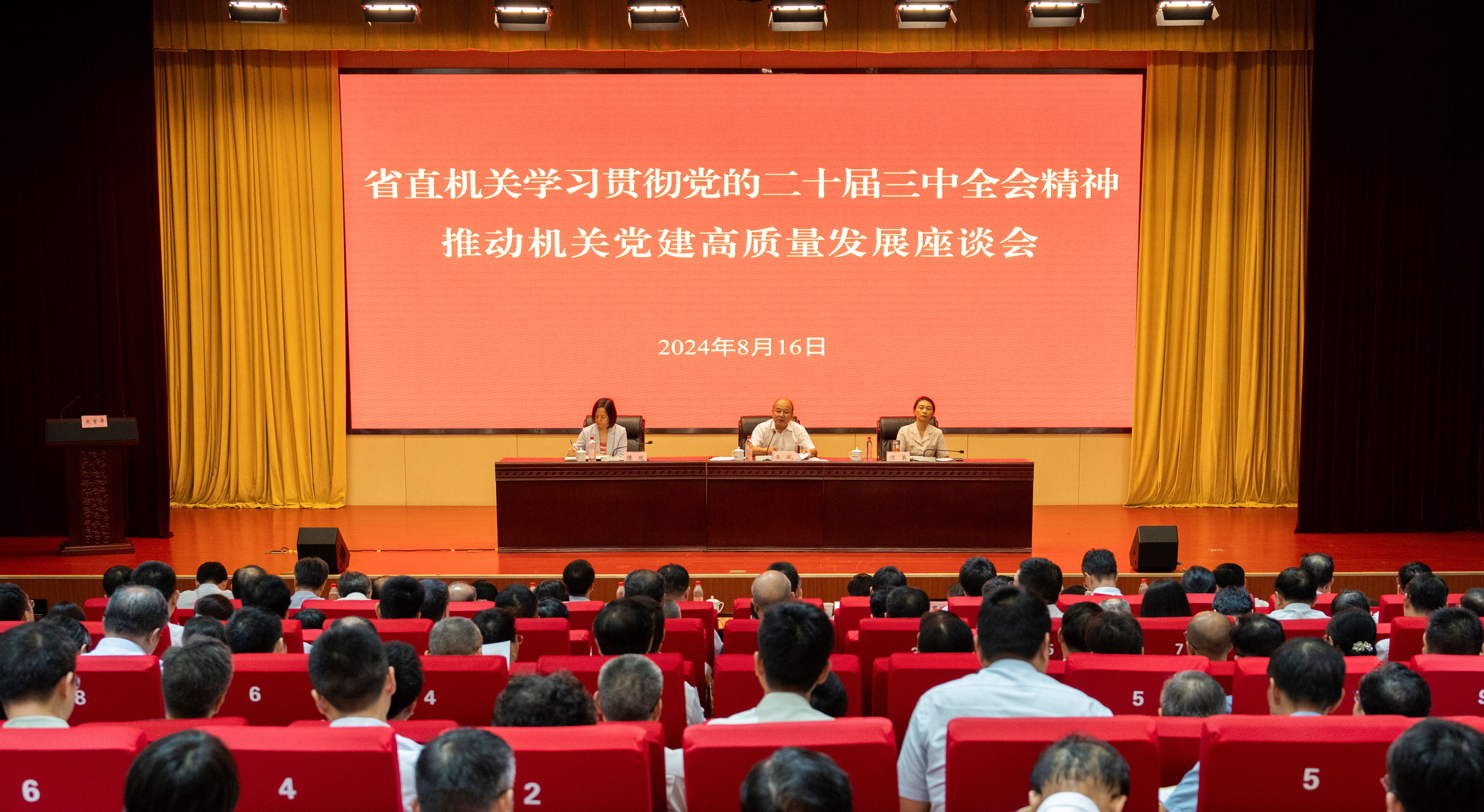 8月16日上午,省直机关学习贯彻党的二十届三中全会精神、推动机关党建高质量发展座谈会召开。省直机关工委书记朱斌主持会议并讲话,省直纪检监察工委书记陈英、省直机关工委副书记陈欢出席会议。
